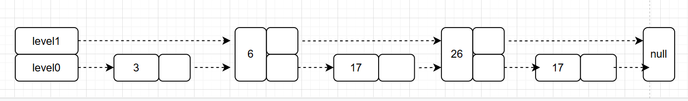 skiplist也是受到这种多层链表的启发设计出来的。根据上面的生成链表,上层节点个数是下层节点个数的一半,查找过程类似二分查找,时间复杂度是O(n)。